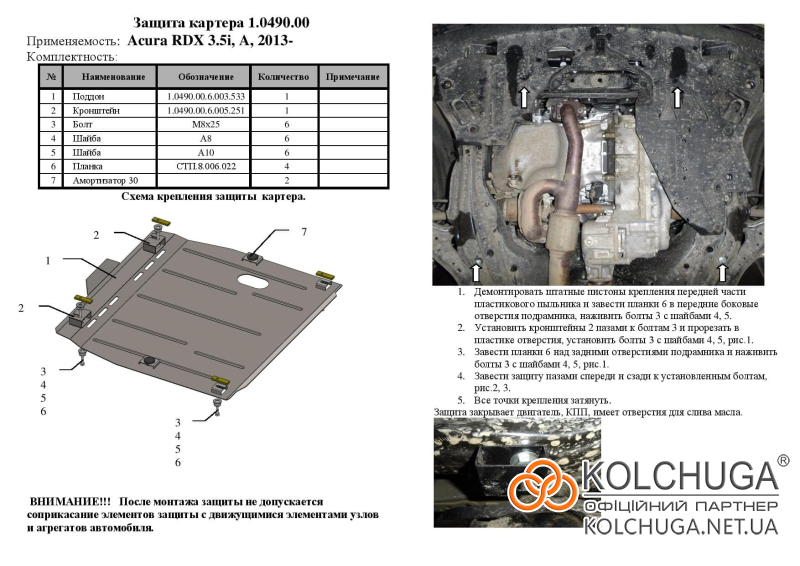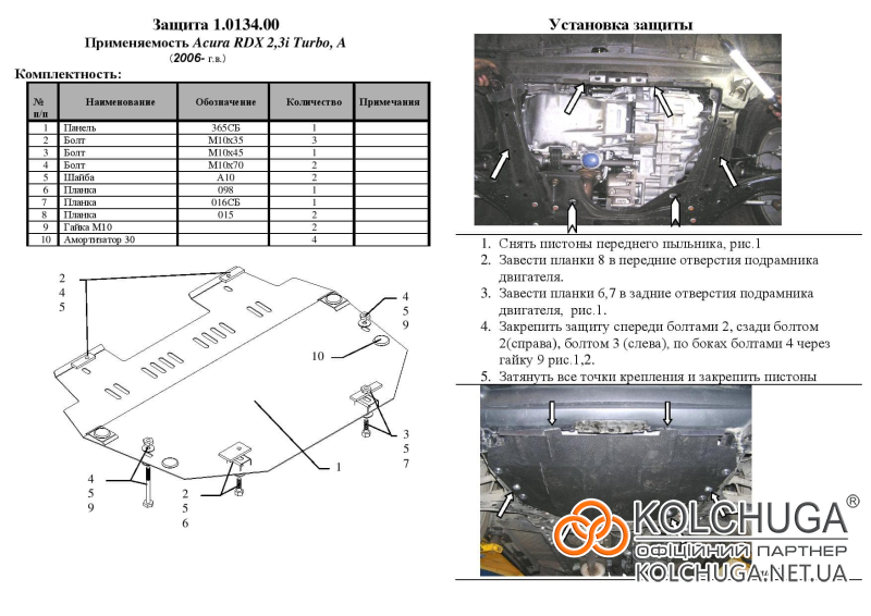 Ochrana motorového priestoru pre Acura RDX 1 2006-2012 sa vyrába pomocou moderných technológií z materiálov najvyššej kvality. Ako základ používame za studena valcovanú oceľ s hrúbkou 2 mm. Pomocou lisovania dávame ochrane jedinečný tvar pre každý automobil tak, aby sa montovala na originálne montážne body bez potreby dodatočného vŕtania alebo zvárania. Vďaka tomu je proces inštalácie maximálne jednoduchý. Všetky potrebné montážne prvky sú súčasťou balenia.
