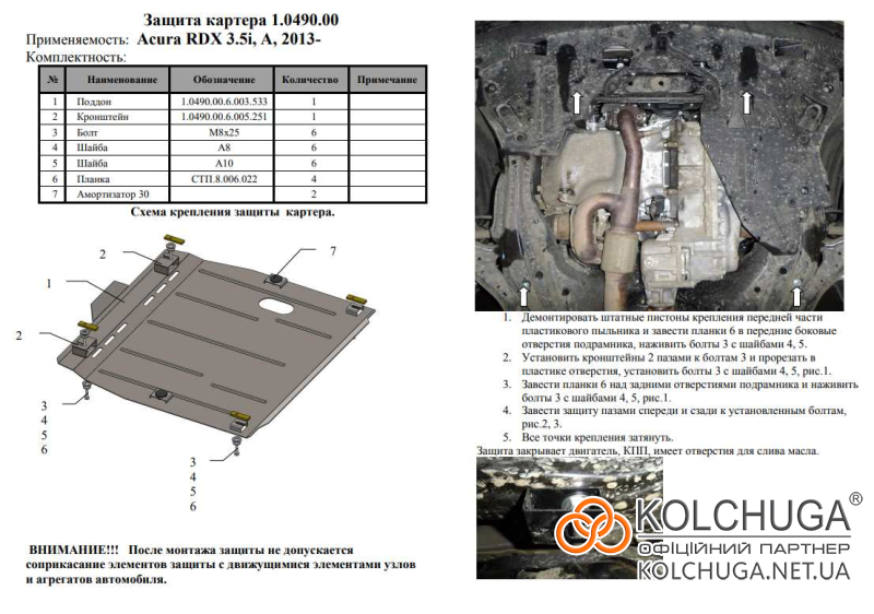 Ochrana motorového priestoru pre Acura RDX 2 Rok výroby 2012-2018 sa vyrába pomocou moderných technológií z materiálov najvyššej kvality. Ako základ používame za studena valcovanú oceľ s hrúbkou 2 mm. Pomocou lisovania dávame ochrane jedinečný tvar pre každý automobil tak, aby sa montovala na originálne montážne body bez potreby dodatočného vŕtania alebo zvárania. Vďaka tomu je proces inštalácie maximálne jednoduchý. Všetky potrebné montážne prvky sú súčasťou balenia.