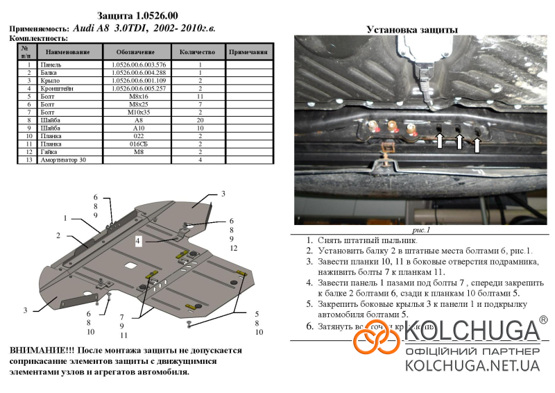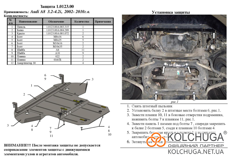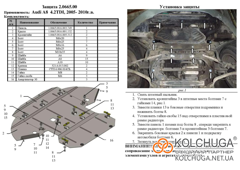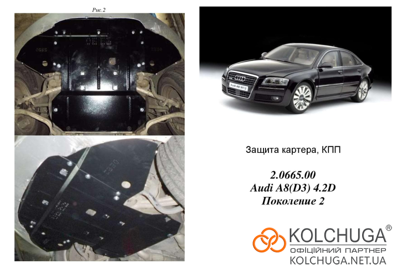 Ochrana motorového priestoru pre Audi A8 D3 rok 2002-2010 sa vyrába pomocou moderných technológií z materiálov najvyššej kvality. Ako základ používame za studena valcovanú oceľ s hrúbkou 2 mm. Pomocou lisovania dávame ochrane jedinečný tvar pre každý automobil tak, aby sa montovala na originálne montážne body bez potreby dodatočného vŕtania alebo zvárania. Vďaka tomu je proces inštalácie maximálne jednoduchý. Všetky potrebné montážne prvky sú súčasťou balenia.