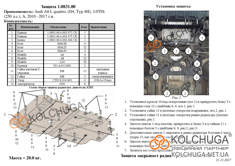 Ochrana motorového priestoru pre Audi A8 D4 L rok 2010-2017 sa vyrába pomocou moderných technológií z materiálov najvyššej kvality. Ako základ používame za studena valcovanú oceľ s hrúbkou 2 mm. Pomocou lisovania dávame ochrane jedinečný tvar pre každý automobil tak, aby sa montovala na originálne montážne body bez potreby dodatočného vŕtania alebo zvárania. Vďaka tomu je proces inštalácie maximálne jednoduchý. Všetky potrebné montážne prvky sú súčasťou balenia.