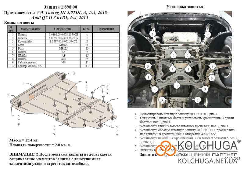 Ochrana motorového priestoru pre Audi Q7 4M rok od 2015 sa vyrába pomocou moderných technológií z materiálov najvyššej kvality. Ako základ používame za studena valcovanú oceľ s hrúbkou 2 mm. Pomocou lisovania dávame ochrane jedinečný tvar pre každý automobil tak, aby sa montovala na originálne montážne body bez potreby dodatočného vŕtania alebo zvárania. Vďaka tomu je proces inštalácie maximálne jednoduchý. Všetky potrebné montážne prvky sú súčasťou balenia.