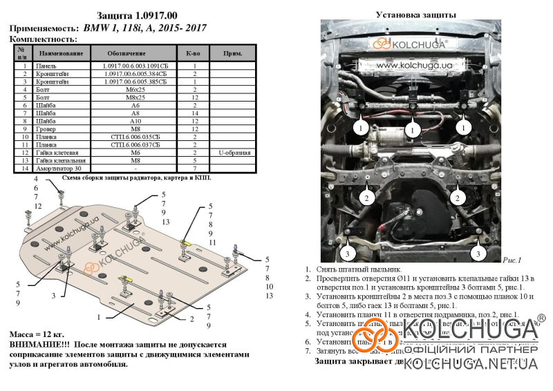 Ochrana motorového priestoru pre BMW 1 F20 F21 rok 2015-2017 sa vyrába pomocou moderných technológií z materiálov najvyššej kvality. Ako základ používame za studena valcovanú oceľ s hrúbkou 2 mm. Pomocou lisovania dávame ochrane jedinečný tvar pre každý automobil tak, aby sa montovala na originálne montážne body bez potreby dodatočného vŕtania alebo zvárania. Vďaka tomu je proces inštalácie maximálne jednoduchý. Všetky potrebné montážne prvky sú súčasťou balenia.