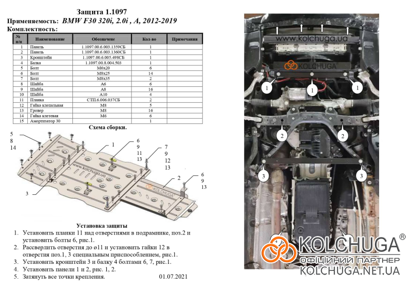 Ochrana motorového priestoru pre BMW 3 F30 rok 2012-2019 sa vyrába pomocou moderných technológií z materiálov najvyššej kvality. Ako základ používame za studena valcovanú oceľ s hrúbkou 2 mm. Pomocou lisovania dávame ochrane jedinečný tvar pre každý automobil tak, aby sa montovala na originálne montážne body bez potreby dodatočného vŕtania alebo zvárania. Vďaka tomu je proces inštalácie maximálne jednoduchý. Všetky potrebné montážne prvky sú súčasťou balenia.