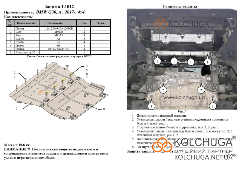 Ochrana motorového priestoru pre BMW 5 G30 rok od 2017 sa vyrába pomocou moderných technológií z materiálov najvyššej kvality. Ako základ používame za studena valcovanú oceľ s hrúbkou 2 mm. Pomocou lisovania dávame ochrane jedinečný tvar pre každý automobil tak, aby sa montovala na originálne montážne body bez potreby dodatočného vŕtania alebo zvárania. Vďaka tomu je proces inštalácie maximálne jednoduchý. Všetky potrebné montážne prvky sú súčasťou balenia.