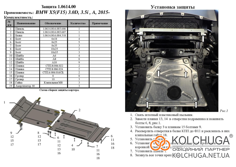 Ochrana motorového priestoru pre BMW X5 F15 rok 2013-2018 sa vyrába pomocou moderných technológií z materiálov najvyššej kvality. Ako základ používame za studena valcovanú oceľ s hrúbkou 2 mm. Pomocou lisovania dávame ochrane jedinečný tvar pre každý automobil tak, aby sa montovala na originálne montážne body bez potreby dodatočného vŕtania alebo zvárania. Vďaka tomu je proces inštalácie maximálne jednoduchý. Všetky potrebné montážne prvky sú súčasťou balenia.