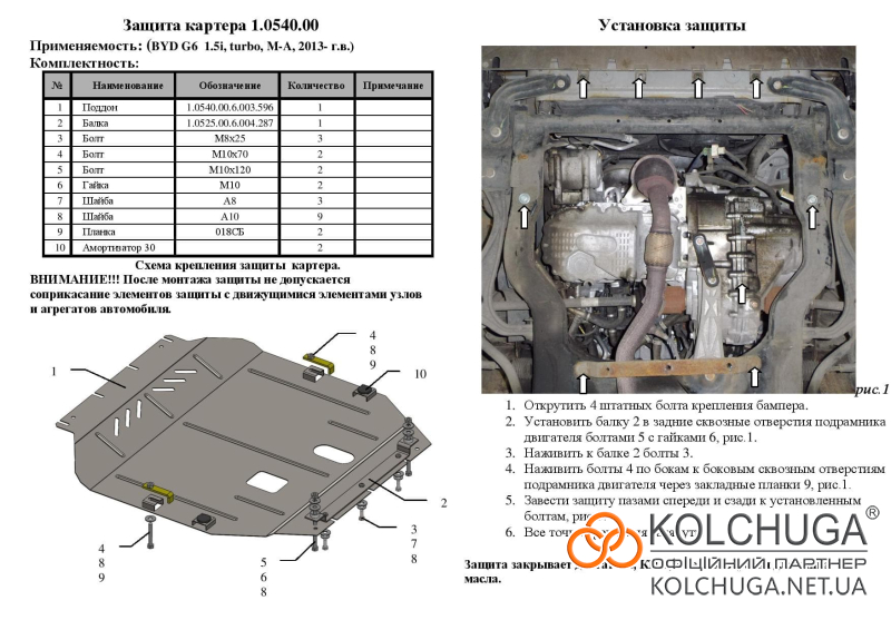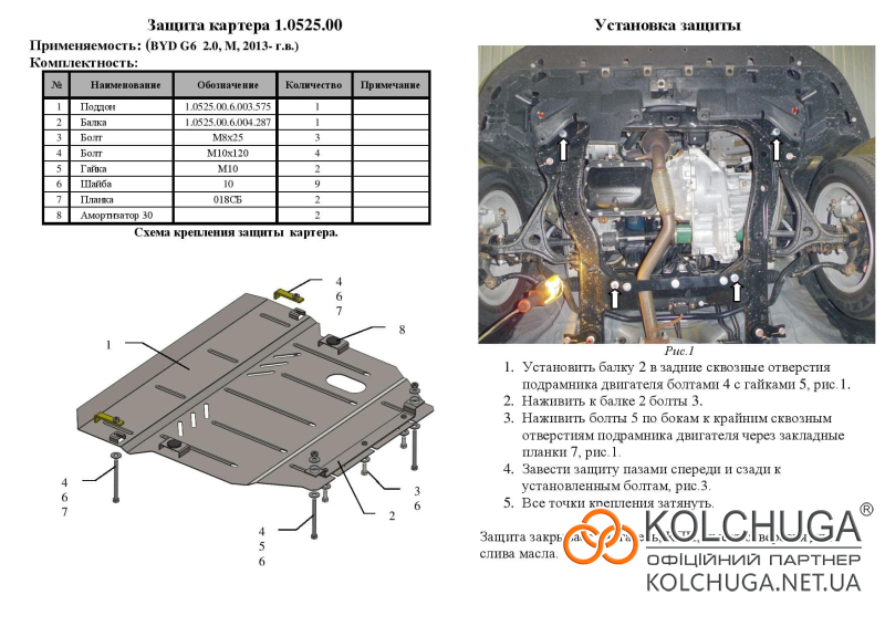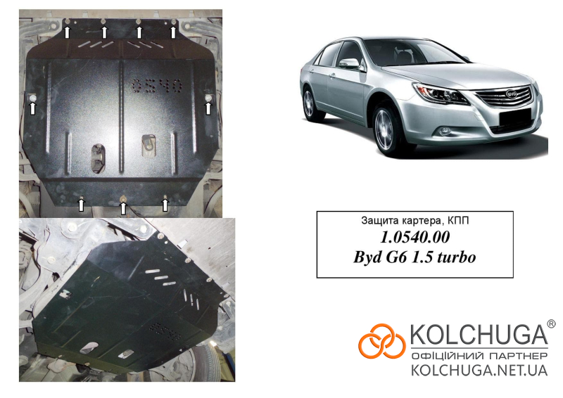 Ochrana motorového priestoru pre BYD G6 rok od 2013 sa vyrába pomocou moderných technológií z materiálov najvyššej kvality. Ako základ používame za studena valcovanú oceľ s hrúbkou 2 mm. Pomocou lisovania dávame ochrane jedinečný tvar pre každý automobil tak, aby sa montovala na originálne montážne body bez potreby dodatočného vŕtania alebo zvárania. Vďaka tomu je proces inštalácie maximálne jednoduchý. Všetky potrebné montážne prvky sú súčasťou balenia.