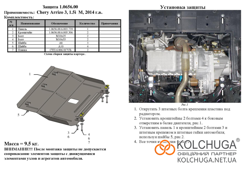 Ochrana motorového priestoru pre Chery Arrizo 3 rok od 2014 sa vyrába pomocou moderných technológií z materiálov najvyššej kvality. Ako základ používame za studena valcovanú oceľ s hrúbkou 2 mm. Pomocou lisovania dávame ochrane jedinečný tvar pre každý automobil tak, aby sa montovala na originálne montážne body bez potreby dodatočného vŕtania alebo zvárania. Vďaka tomu je proces inštalácie maximálne jednoduchý. Všetky potrebné montážne prvky sú súčasťou balenia.