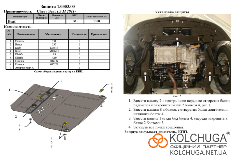 Ochrana motorového priestoru pre Chery Beat rok od 2011 sa vyrába pomocou moderných technológií z materiálov najvyššej kvality. Ako základ používame za studena valcovanú oceľ s hrúbkou 2 mm. Pomocou lisovania dávame ochrane jedinečný tvar pre každý automobil tak, aby sa montovala na originálne montážne body bez potreby dodatočného vŕtania alebo zvárania. Vďaka tomu je proces inštalácie maximálne jednoduchý. Všetky potrebné montážne prvky sú súčasťou balenia.