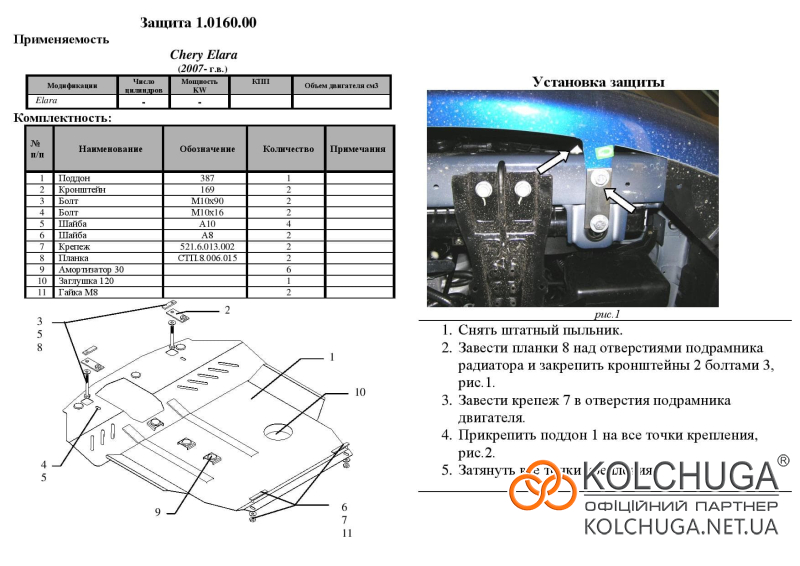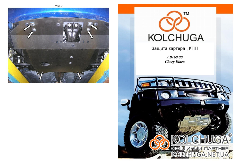 Ochrana motorového priestoru pre Chery Elara 1 rok 2006-2011 sa vyrába pomocou moderných technológií z materiálov najvyššej kvality. Ako základ používame za studena valcovanú oceľ s hrúbkou 2 mm. Pomocou lisovania dávame ochrane jedinečný tvar pre každý automobil tak, aby sa montovala na originálne montážne body bez potreby dodatočného vŕtania alebo zvárania. Vďaka tomu je proces inštalácie maximálne jednoduchý. Všetky potrebné montážne prvky sú súčasťou balenia.