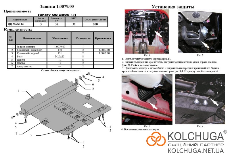 Ochrana motorového priestoru pre Chery QQ rok od 2003 sa vyrába pomocou moderných technológií z materiálov najvyššej kvality. Ako základ používame za studena valcovanú oceľ s hrúbkou 2 mm. Pomocou lisovania dávame ochrane jedinečný tvar pre každý automobil tak, aby sa montovala na originálne montážne body bez potreby dodatočného vŕtania alebo zvárania. Vďaka tomu je proces inštalácie maximálne jednoduchý. Všetky potrebné montážne prvky sú súčasťou balenia.