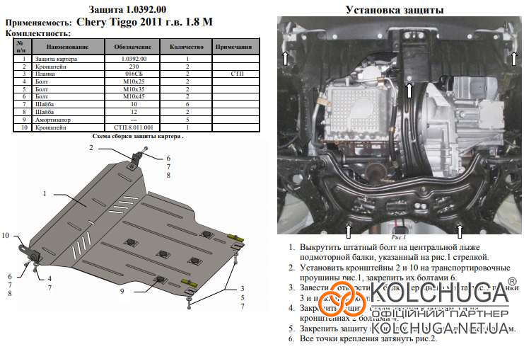 Ochrana motorového priestoru pre Chery Tiggo 1 facelift rok 2011-2014 sa vyrába pomocou moderných technológií z materiálov najvyššej kvality. Ako základ používame za studena valcovanú oceľ s hrúbkou 2 mm. Pomocou lisovania dávame ochrane jedinečný tvar pre každý automobil tak, aby sa montovala na originálne montážne body bez potreby dodatočného vŕtania alebo zvárania. Vďaka tomu je proces inštalácie maximálne jednoduchý. Všetky potrebné montážne prvky sú súčasťou balenia.