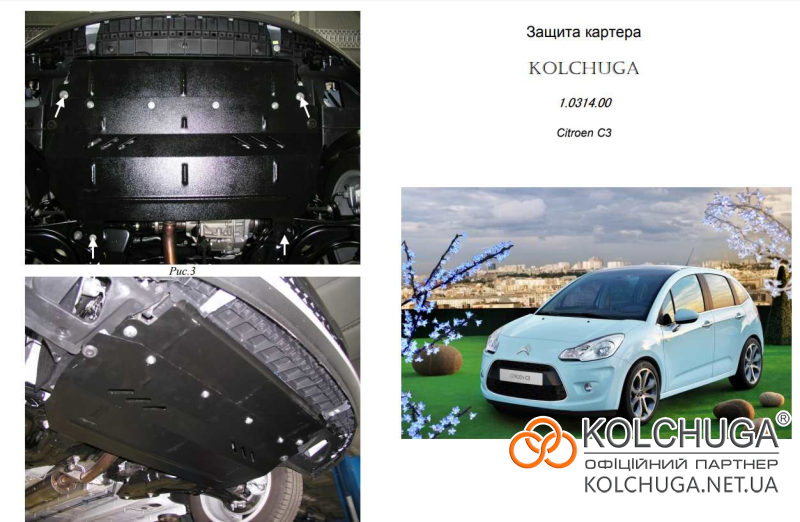 Ochrana motora Citroen C3 2 rok 2009-2016 nielenže chráni olejovú vaňu pred fyzickým nárazom, ale zároveň celý motorový priestor pred vniknutím vody, prachu a nečistôt. To výrazne predlžuje životnosť remeňov, kladiek a ďalších pohyblivých častí v motorovom priestore. Ochrany sa inštalujú namiesto plastových a ich plynulé tvary kopírujú tvar podvozku vozidla, čím zlepšujú aerodynamiku.