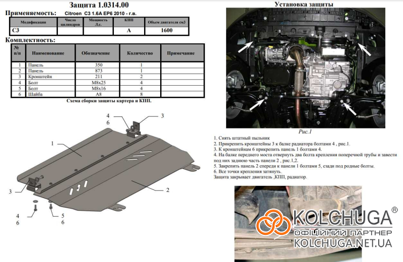 Ochrana motorového priestoru pre Citroen C3 2 rok 2009-2016 sa vyrába pomocou moderných technológií z materiálov najvyššej kvality. Ako základ používame za studena valcovanú oceľ s hrúbkou 2 mm. Pomocou lisovania dávame ochrane jedinečný tvar pre každý automobil tak, aby sa montovala na originálne montážne body bez potreby dodatočného vŕtania alebo zvárania. Vďaka tomu je proces inštalácie maximálne jednoduchý. Všetky potrebné montážne prvky sú súčasťou balenia.