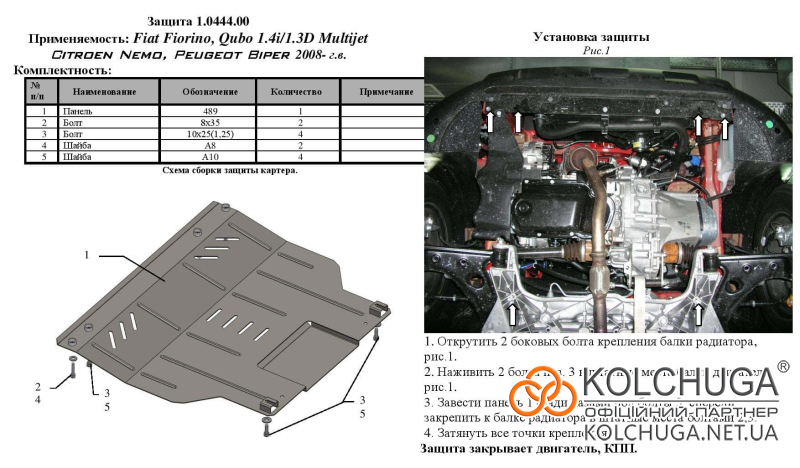 Ochrana motorového priestoru pre Citroen Nemo rok od 2007 sa vyrába pomocou moderných technológií z materiálov najvyššej kvality. Ako základ používame za studena valcovanú oceľ s hrúbkou 2 mm. Pomocou lisovania dávame ochrane jedinečný tvar pre každý automobil tak, aby sa montovala na originálne montážne body bez potreby dodatočného vŕtania alebo zvárania. Vďaka tomu je proces inštalácie maximálne jednoduchý. Všetky potrebné montážne prvky sú súčasťou balenia.