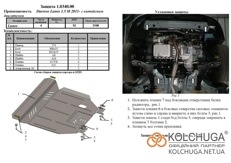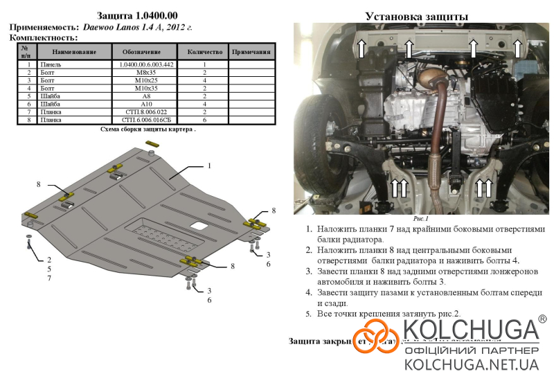 Ochrana motorového priestoru pre Daewoo Lanos rok od 1997 sa vyrába pomocou moderných technológií z materiálov najvyššej kvality. Ako základ používame za studena valcovanú oceľ s hrúbkou 2 mm. Pomocou lisovania dávame ochrane jedinečný tvar pre každý automobil tak, aby sa montovala na originálne montážne body bez potreby dodatočného vŕtania alebo zvárania. Vďaka tomu je proces inštalácie maximálne jednoduchý. Všetky potrebné montážne prvky sú súčasťou balenia.