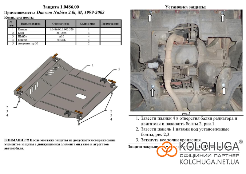 Ochrana motorového priestoru pre Daewoo Nubira 2 rok 1999-2003 sa vyrába pomocou moderných technológií z materiálov najvyššej kvality. Ako základ používame za studena valcovanú oceľ s hrúbkou 2 mm. Pomocou lisovania dávame ochrane jedinečný tvar pre každý automobil tak, aby sa montovala na originálne montážne body bez potreby dodatočného vŕtania alebo zvárania. Vďaka tomu je proces inštalácie maximálne jednoduchý. Všetky potrebné montážne prvky sú súčasťou balenia.