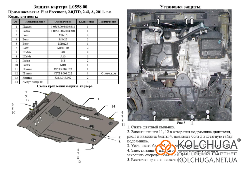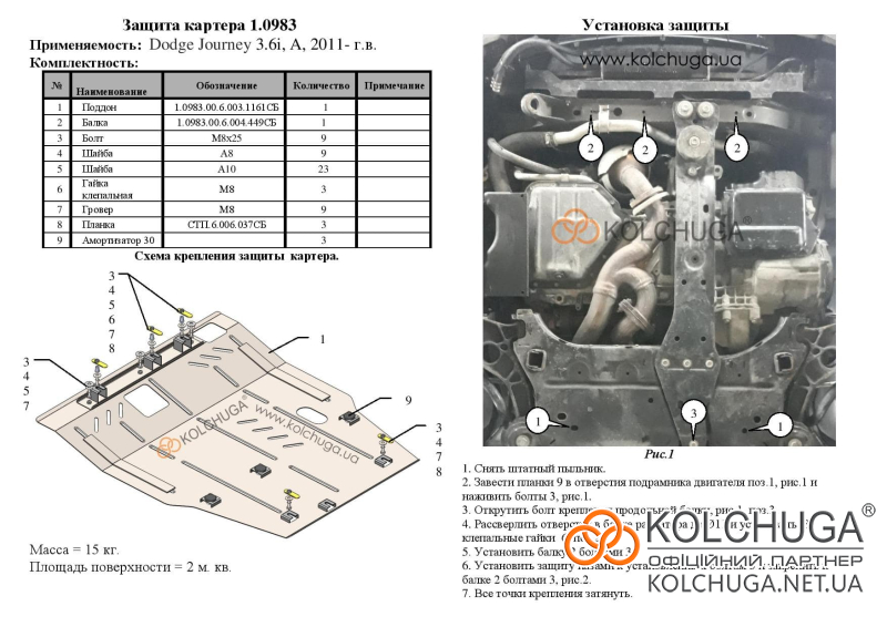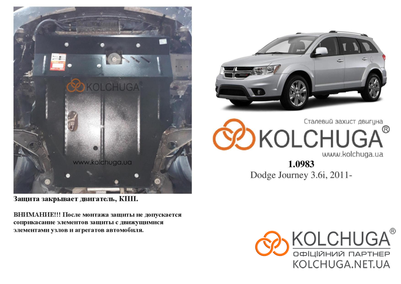 Ochrana motorového priestoru pre Dodge Journey rok od 2011 sa vyrába pomocou moderných technológií z materiálov najvyššej kvality. Ako základ používame za studena valcovanú oceľ s hrúbkou 2 mm. Pomocou lisovania dávame ochrane jedinečný tvar pre každý automobil tak, aby sa montovala na originálne montážne body bez potreby dodatočného vŕtania alebo zvárania. Vďaka tomu je proces inštalácie maximálne jednoduchý. Všetky potrebné montážne prvky sú súčasťou balenia.