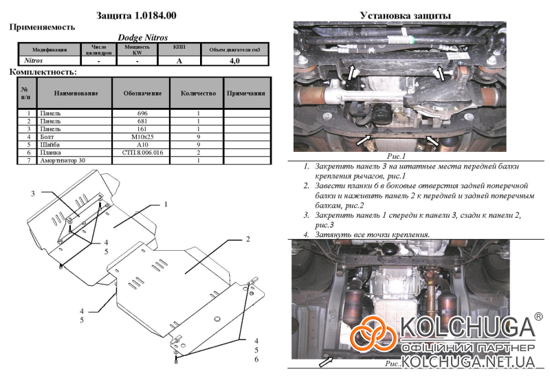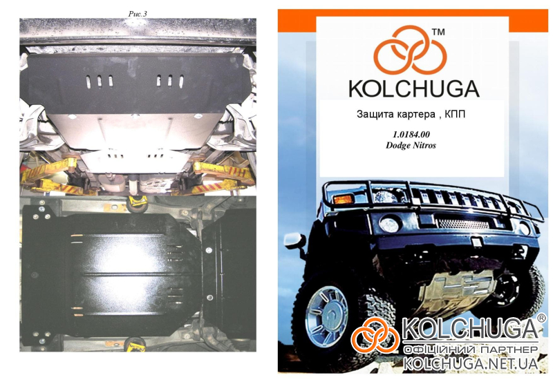 Ochrana motorového priestoru pre Dodge Nitro I rok 2007-2012 sa vyrába pomocou moderných technológií z materiálov najvyššej kvality. Ako základ používame za studena valcovanú oceľ s hrúbkou 2 mm. Pomocou lisovania dávame ochrane jedinečný tvar pre každý automobil tak, aby sa montovala na originálne montážne body bez potreby dodatočného vŕtania alebo zvárania. Vďaka tomu je proces inštalácie maximálne jednoduchý. Všetky potrebné montážne prvky sú súčasťou balenia.