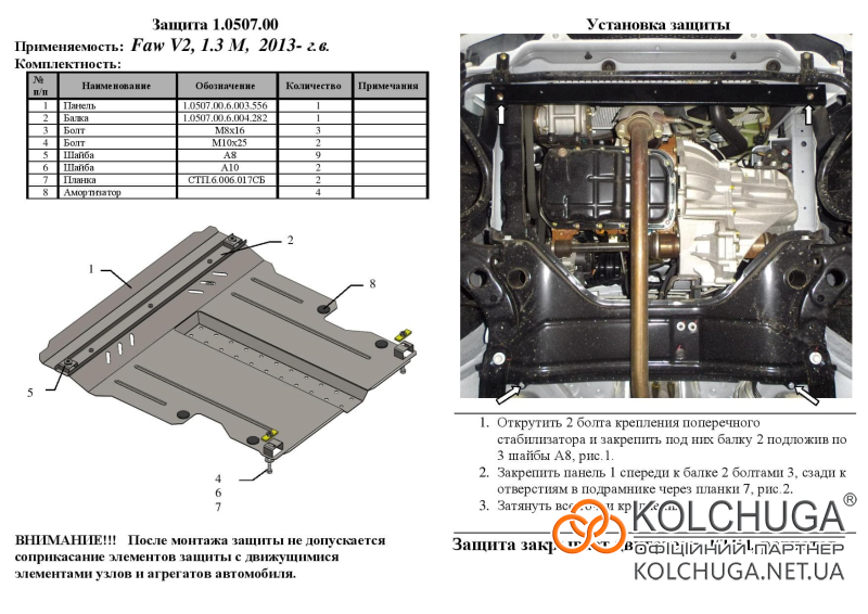 Ochrana motorového priestoru pre Faw V2 rok od 2013 sa vyrába pomocou moderných technológií z materiálov najvyššej kvality. Ako základ používame za studena valcovanú oceľ s hrúbkou 2 mm. Pomocou lisovania dávame ochrane jedinečný tvar pre každý automobil tak, aby sa montovala na originálne montážne body bez potreby dodatočného vŕtania alebo zvárania. Vďaka tomu je proces inštalácie maximálne jednoduchý. Všetky potrebné montážne prvky sú súčasťou balenia.