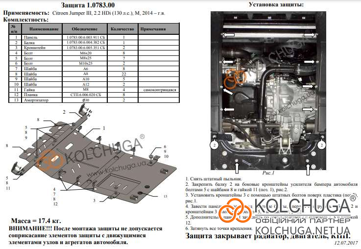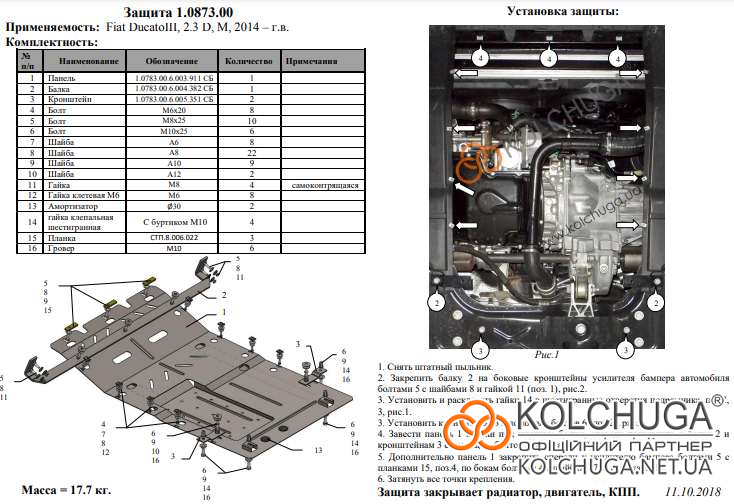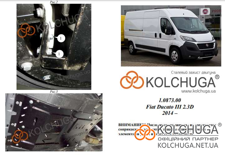 Ochrana motorového priestoru pre Fiat Ducato 3 facelift rok od 2014 sa vyrába pomocou moderných technológií z materiálov najvyššej kvality. Ako základ používame za studena valcovanú oceľ s hrúbkou 2 mm. Pomocou lisovania dávame ochrane jedinečný tvar pre každý automobil tak, aby sa montovala na originálne montážne body bez potreby dodatočného vŕtania alebo zvárania. Vďaka tomu je proces inštalácie maximálne jednoduchý. Všetky potrebné montážne prvky sú súčasťou balenia.