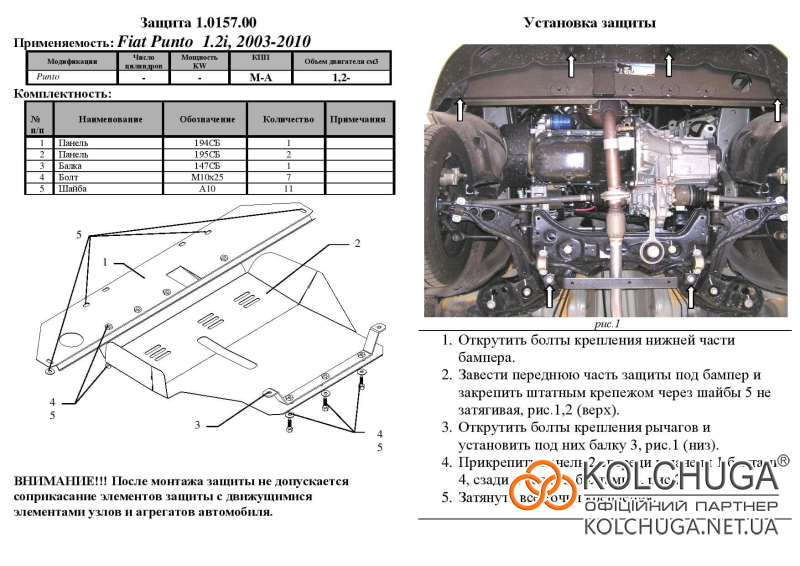 Ochrana motorového priestoru pre Fiat Punto Classic rok 2007-2010 sa vyrába pomocou moderných technológií z materiálov najvyššej kvality. Ako základ používame za studena valcovanú oceľ s hrúbkou 2 mm. Pomocou lisovania dávame ochrane jedinečný tvar pre každý automobil tak, aby sa montovala na originálne montážne body bez potreby dodatočného vŕtania alebo zvárania. Vďaka tomu je proces inštalácie maximálne jednoduchý. Všetky potrebné montážne prvky sú súčasťou balenia.