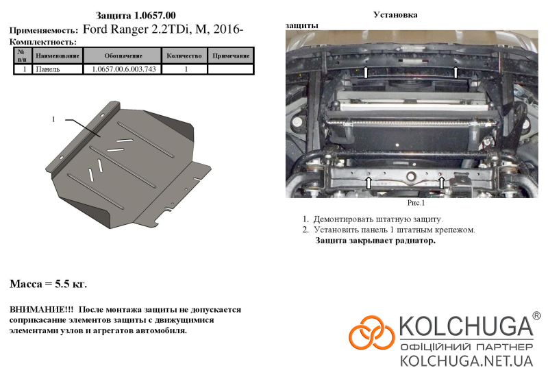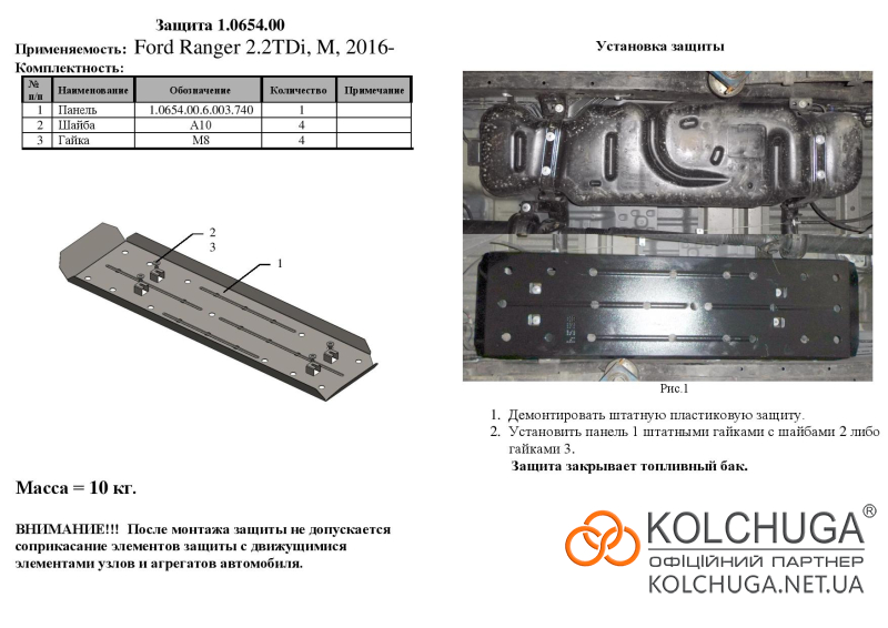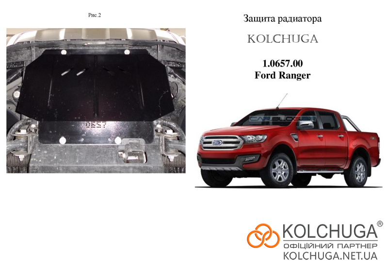 Ochrana motorového priestoru pre Ford Ranger 3 rok 2011-2018 sa vyrába pomocou moderných technológií z materiálov najvyššej kvality. Ako základ používame za studena valcovanú oceľ s hrúbkou 2 mm. Pomocou lisovania dávame ochrane jedinečný tvar pre každý automobil tak, aby sa montovala na originálne montážne body bez potreby dodatočného vŕtania alebo zvárania. Vďaka tomu je proces inštalácie maximálne jednoduchý. Všetky potrebné montážne prvky sú súčasťou balenia.