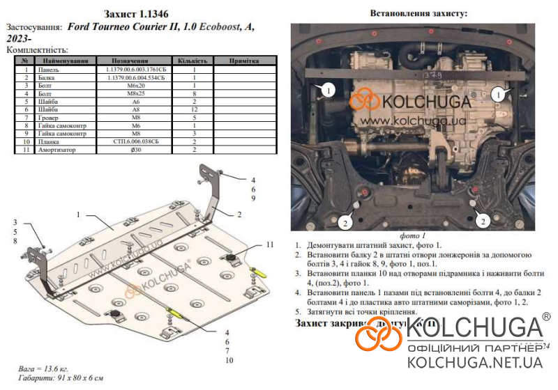 Ochrana motorového priestoru pre Ford Tourneo Courier 2 rok od 2023 sa vyrába pomocou moderných technológií z materiálov najvyššej kvality. Ako základ používame za studena valcovanú oceľ s hrúbkou 2 mm. Pomocou lisovania dávame ochrane jedinečný tvar pre každý automobil tak, aby sa montovala na originálne montážne body bez potreby dodatočného vŕtania alebo zvárania. Vďaka tomu je proces inštalácie maximálne jednoduchý. Všetky potrebné montážne prvky sú súčasťou balenia.