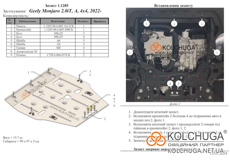 Ochrana motorového priestoru pre Geely Monjaro rok od 2022 sa vyrába pomocou moderných technológií z materiálov najvyššej kvality. Ako základ používame za studena valcovanú oceľ s hrúbkou 2 mm. Pomocou lisovania dávame ochrane jedinečný tvar pre každý automobil tak, aby sa montovala na originálne montážne body bez potreby dodatočného vŕtania alebo zvárania. Vďaka tomu je proces inštalácie maximálne jednoduchý. Všetky potrebné montážne prvky sú súčasťou balenia.