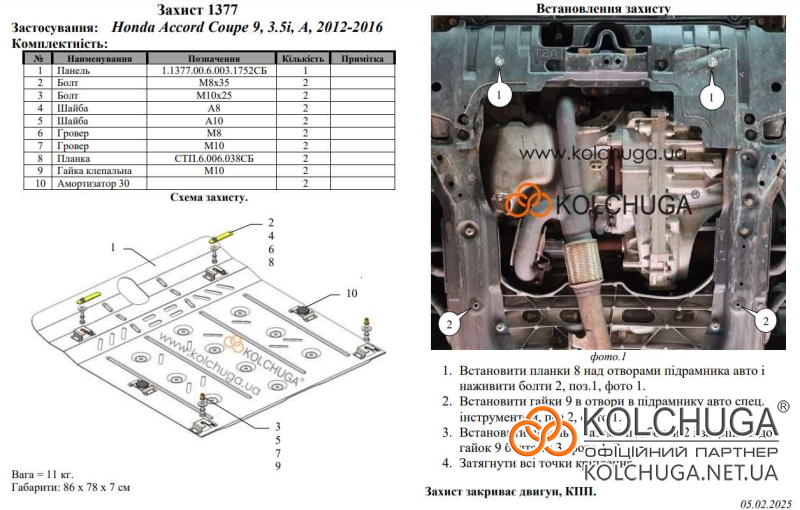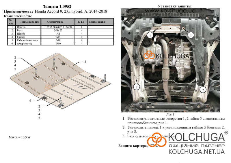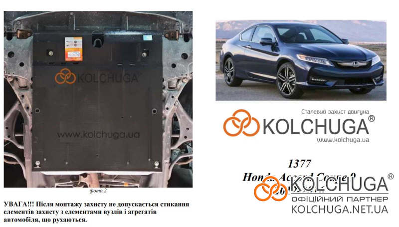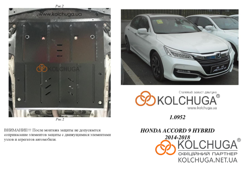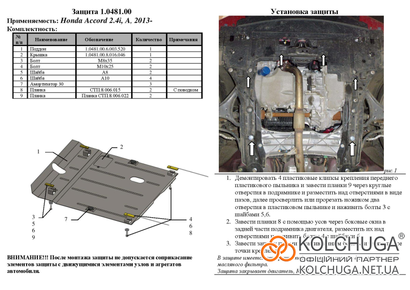 Ochrana motorového priestoru pre Honda Accord 9 rok 2012-2017 sa vyrába pomocou moderných technológií z materiálov najvyššej kvality. Ako základ používame za studena valcovanú oceľ s hrúbkou 2 mm. Pomocou lisovania dávame ochrane jedinečný tvar pre každý automobil tak, aby sa montovala na originálne montážne body bez potreby dodatočného vŕtania alebo zvárania. Vďaka tomu je proces inštalácie maximálne jednoduchý. Všetky potrebné montážne prvky sú súčasťou balenia.