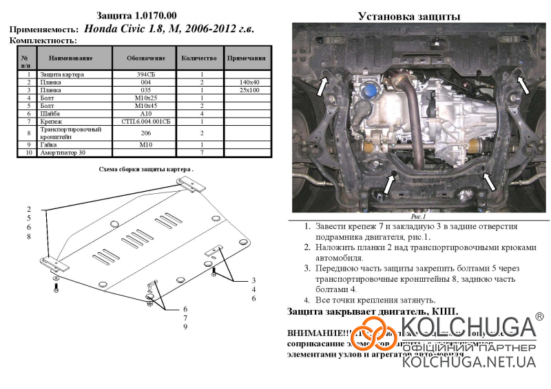 Ochrana motorového priestoru pre Honda Civic 8 4D sedan, liftback rok 2006-2012 sa vyrába pomocou moderných technológií z materiálov najvyššej kvality. Ako základ používame za studena valcovanú oceľ s hrúbkou 2 mm. Pomocou lisovania dávame ochrane jedinečný tvar pre každý automobil tak, aby sa montovala na originálne montážne body bez potreby dodatočného vŕtania alebo zvárania. Vďaka tomu je proces inštalácie maximálne jednoduchý. Všetky potrebné montážne prvky sú súčasťou balenia.