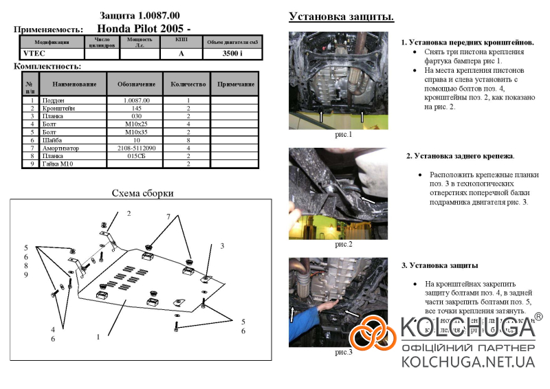 Ochrana motorového priestoru pre Honda Pilot 1 rok 2002-2008 sa vyrába pomocou moderných technológií z materiálov najvyššej kvality. Ako základ používame za studena valcovanú oceľ s hrúbkou 2 mm. Pomocou lisovania dávame ochrane jedinečný tvar pre každý automobil tak, aby sa montovala na originálne montážne body bez potreby dodatočného vŕtania alebo zvárania. Vďaka tomu je proces inštalácie maximálne jednoduchý. Všetky potrebné montážne prvky sú súčasťou balenia.