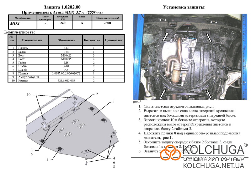 Ochrana motorového priestoru pre Honda Pilot 2 rok 2008-2012 sa vyrába pomocou moderných technológií z materiálov najvyššej kvality. Ako základ používame za studena valcovanú oceľ s hrúbkou 2 mm. Pomocou lisovania dávame ochrane jedinečný tvar pre každý automobil tak, aby sa montovala na originálne montážne body bez potreby dodatočného vŕtania alebo zvárania. Vďaka tomu je proces inštalácie maximálne jednoduchý. Všetky potrebné montážne prvky sú súčasťou balenia.