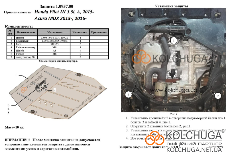 Ochrana motorového priestoru pre Honda Pilot 3 rok od 2015 sa vyrába pomocou moderných technológií z materiálov najvyššej kvality. Ako základ používame za studena valcovanú oceľ s hrúbkou 2 mm. Pomocou lisovania dávame ochrane jedinečný tvar pre každý automobil tak, aby sa montovala na originálne montážne body bez potreby dodatočného vŕtania alebo zvárania. Vďaka tomu je proces inštalácie maximálne jednoduchý. Všetky potrebné montážne prvky sú súčasťou balenia.