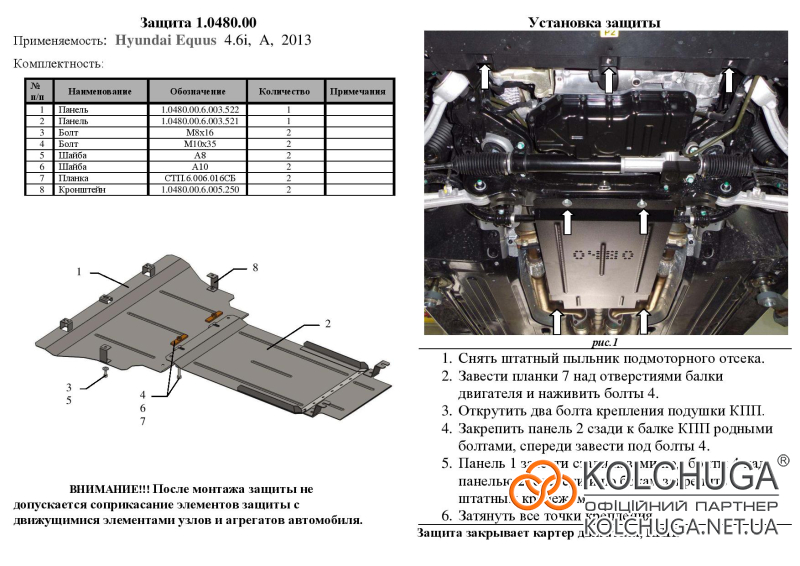 Ochrana motorového priestoru pre Hyundai Equus rok od 2013 sa vyrába pomocou moderných technológií z materiálov najvyššej kvality. Ako základ používame za studena valcovanú oceľ s hrúbkou 2 mm. Pomocou lisovania dávame ochrane jedinečný tvar pre každý automobil tak, aby sa montovala na originálne montážne body bez potreby dodatočného vŕtania alebo zvárania. Vďaka tomu je proces inštalácie maximálne jednoduchý. Všetky potrebné montážne prvky sú súčasťou balenia.