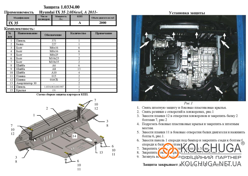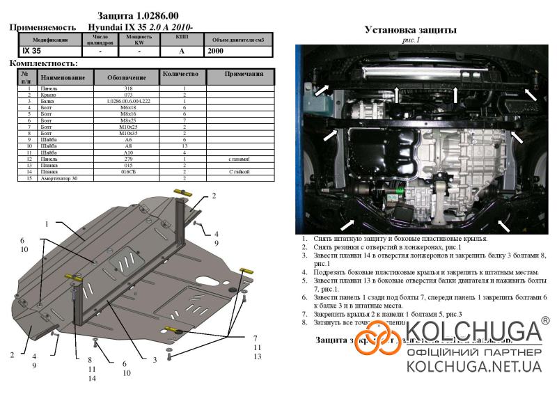 Ochrana motorového priestoru pre Hyundai ix35 rok od 2010 sa vyrába pomocou moderných technológií z materiálov najvyššej kvality. Ako základ používame za studena valcovanú oceľ s hrúbkou 2 mm. Pomocou lisovania dávame ochrane jedinečný tvar pre každý automobil tak, aby sa montovala na originálne montážne body bez potreby dodatočného vŕtania alebo zvárania. Vďaka tomu je proces inštalácie maximálne jednoduchý. Všetky potrebné montážne prvky sú súčasťou balenia.