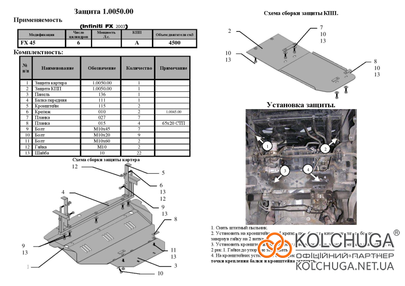 Ochrana motorového priestoru pre Infiniti FX 45 rok 2003-2008 sa vyrába pomocou moderných technológií z materiálov najvyššej kvality. Ako základ používame za studena valcovanú oceľ s hrúbkou 2 mm. Pomocou lisovania dávame ochrane jedinečný tvar pre každý automobil tak, aby sa montovala na originálne montážne body bez potreby dodatočného vŕtania alebo zvárania. Vďaka tomu je proces inštalácie maximálne jednoduchý. Všetky potrebné montážne prvky sú súčasťou balenia.