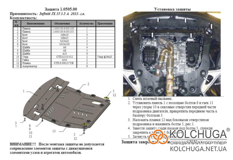 Ochrana motorového priestoru pre Infiniti QX60 I rok 2013-2021 sa vyrába pomocou moderných technológií z materiálov najvyššej kvality. Ako základ používame za studena valcovanú oceľ s hrúbkou 2 mm. Pomocou lisovania dávame ochrane jedinečný tvar pre každý automobil tak, aby sa montovala na originálne montážne body bez potreby dodatočného vŕtania alebo zvárania. Vďaka tomu je proces inštalácie maximálne jednoduchý. Všetky potrebné montážne prvky sú súčasťou balenia.