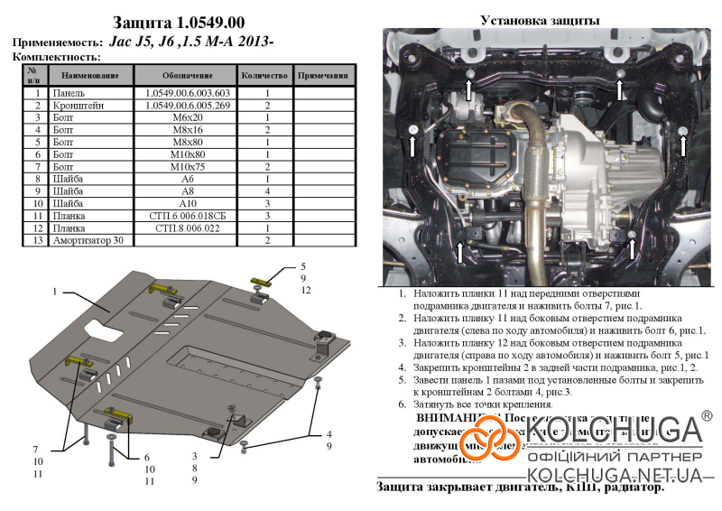Ochrana motorového priestoru pre Jac J5 rok od 2013 sa vyrába pomocou moderných technológií z materiálov najvyššej kvality. Ako základ používame za studena valcovanú oceľ s hrúbkou 2 mm. Pomocou lisovania dávame ochrane jedinečný tvar pre každý automobil tak, aby sa montovala na originálne montážne body bez potreby dodatočného vŕtania alebo zvárania. Vďaka tomu je proces inštalácie maximálne jednoduchý. Všetky potrebné montážne prvky sú súčasťou balenia.