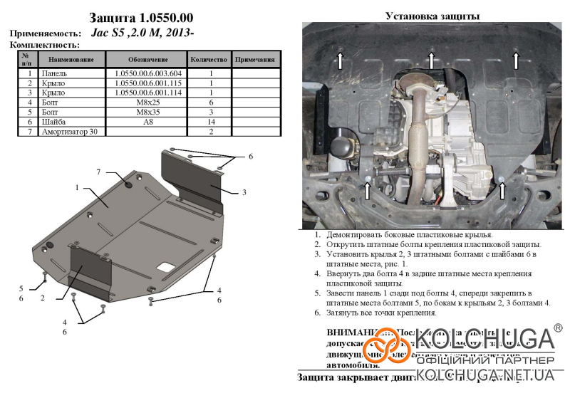 Ochrana motorového priestoru pre Jac S5 rok od 2013 sa vyrába pomocou moderných technológií z materiálov najvyššej kvality. Ako základ používame za studena valcovanú oceľ s hrúbkou 2 mm. Pomocou lisovania dávame ochrane jedinečný tvar pre každý automobil tak, aby sa montovala na originálne montážne body bez potreby dodatočného vŕtania alebo zvárania. Vďaka tomu je proces inštalácie maximálne jednoduchý. Všetky potrebné montážne prvky sú súčasťou balenia.