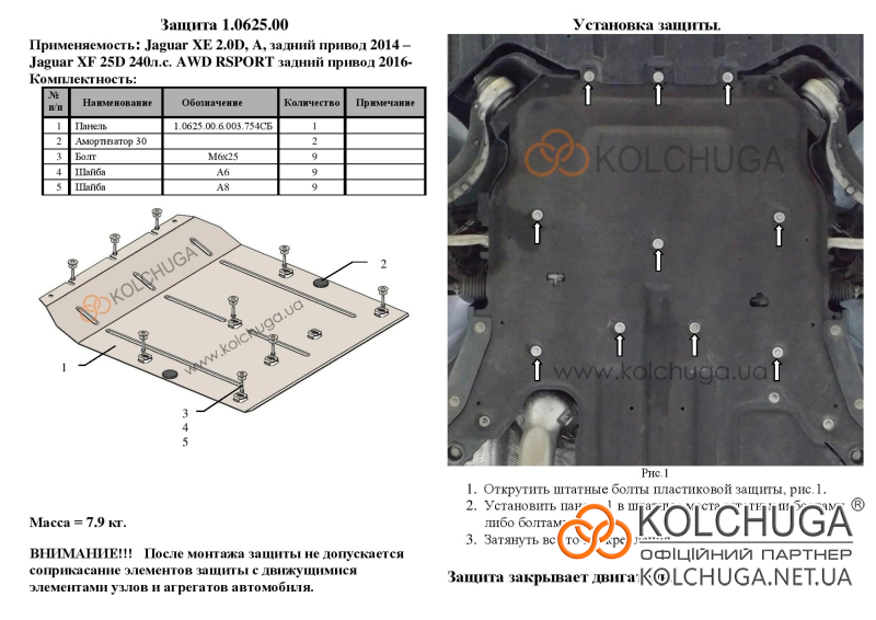 Ochrana motorového priestoru pre Jaguar XF rok od 2016 sa vyrába pomocou moderných technológií z materiálov najvyššej kvality. Ako základ používame za studena valcovanú oceľ s hrúbkou 2 mm. Pomocou lisovania dávame ochrane jedinečný tvar pre každý automobil tak, aby sa montovala na originálne montážne body bez potreby dodatočného vŕtania alebo zvárania. Vďaka tomu je proces inštalácie maximálne jednoduchý. Všetky potrebné montážne prvky sú súčasťou balenia.