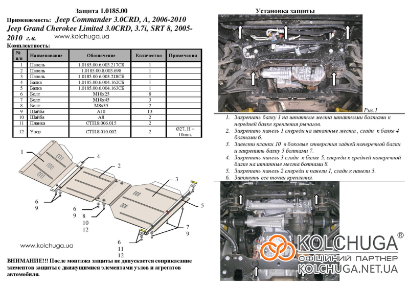 Ochrana motorového priestoru pre Jeep Grand Cherokee 3 (WK) rok 2004-2010 sa vyrába pomocou moderných technológií z materiálov najvyššej kvality. Ako základ používame za studena valcovanú oceľ s hrúbkou 2 mm. Pomocou lisovania dávame ochrane jedinečný tvar pre každý automobil tak, aby sa montovala na originálne montážne body bez potreby dodatočného vŕtania alebo zvárania. Vďaka tomu je proces inštalácie maximálne jednoduchý. Všetky potrebné montážne prvky sú súčasťou balenia.