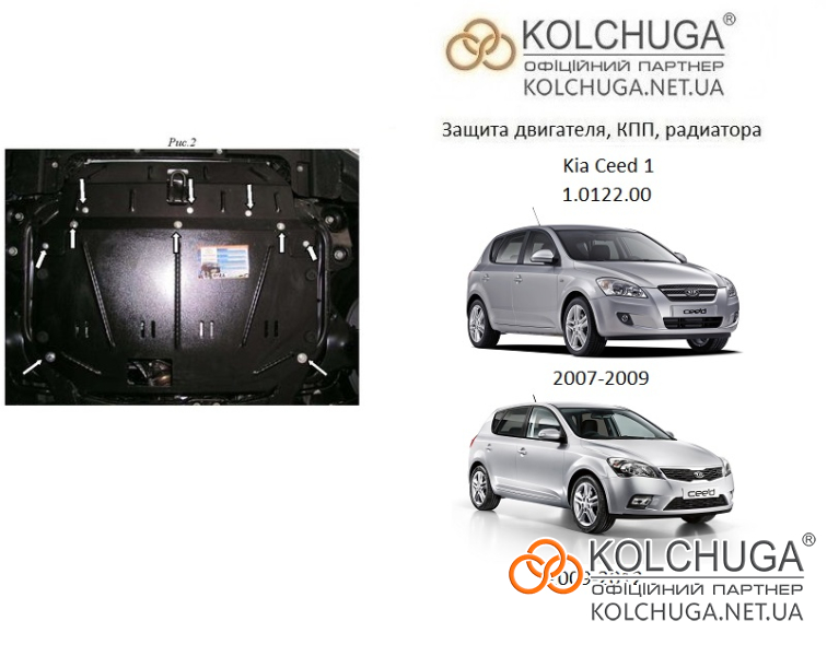 Ochrana motorového priestoru pre Kia Ceed 1 rok 2006-2012 sa vyrába pomocou moderných technológií z materiálov najvyššej kvality. Ako základ používame za studena valcovanú oceľ s hrúbkou 2 mm. Pomocou lisovania dávame ochrane jedinečný tvar pre každý automobil tak, aby sa montovala na originálne montážne body bez potreby dodatočného vŕtania alebo zvárania. Vďaka tomu je proces inštalácie maximálne jednoduchý. Všetky potrebné montážne prvky sú súčasťou balenia.