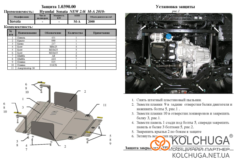 Ochrana motorového priestoru pre Kia K5 1 rok 2010-2015 sa vyrába pomocou moderných technológií z materiálov najvyššej kvality. Ako základ používame za studena valcovanú oceľ s hrúbkou 2 mm. Pomocou lisovania dávame ochrane jedinečný tvar pre každý automobil tak, aby sa montovala na originálne montážne body bez potreby dodatočného vŕtania alebo zvárania. Vďaka tomu je proces inštalácie maximálne jednoduchý. Všetky potrebné montážne prvky sú súčasťou balenia.