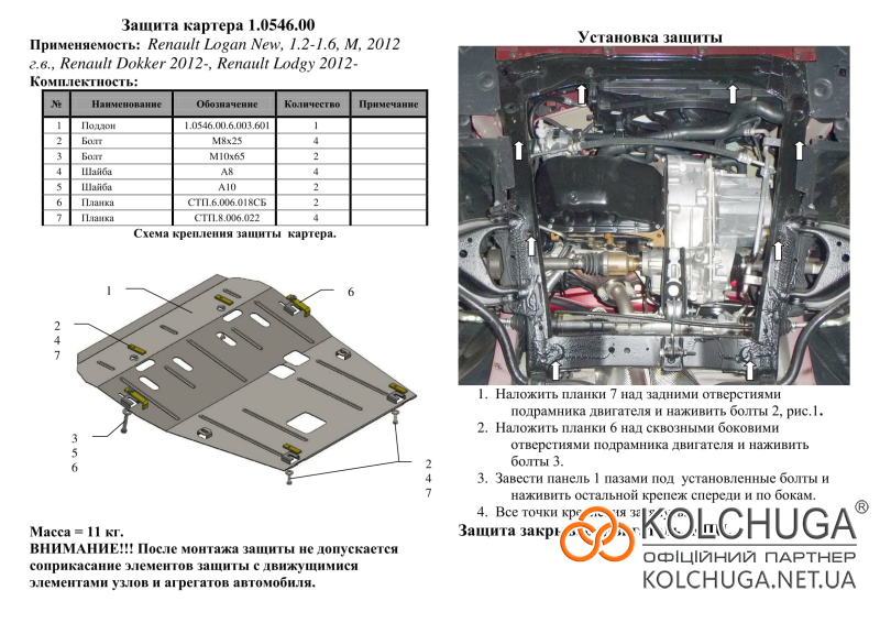 Ochrana motorového priestoru pre Lada Largus rok od 2012 sa vyrába pomocou moderných technológií z materiálov najvyššej kvality. Ako základ používame za studena valcovanú oceľ s hrúbkou 2 mm. Pomocou lisovania dávame ochrane jedinečný tvar pre každý automobil tak, aby sa montovala na originálne montážne body bez potreby dodatočného vŕtania alebo zvárania. Vďaka tomu je proces inštalácie maximálne jednoduchý. Všetky potrebné montážne prvky sú súčasťou balenia.