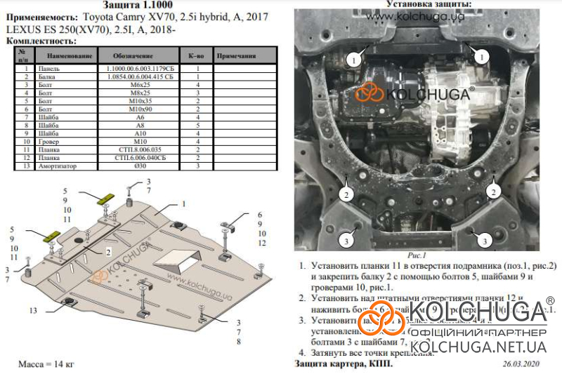 Ochrana motorového priestoru pre Lexus ES 250 VII rok od 2018 sa vyrába pomocou moderných technológií z materiálov najvyššej kvality. Ako základ používame za studena valcovanú oceľ s hrúbkou 2 mm. Pomocou lisovania dávame ochrane jedinečný tvar pre každý automobil tak, aby sa montovala na originálne montážne body bez potreby dodatočného vŕtania alebo zvárania. Vďaka tomu je proces inštalácie maximálne jednoduchý. Všetky potrebné montážne prvky sú súčasťou balenia.