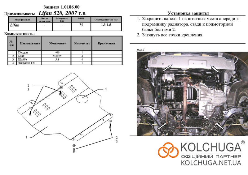 Ochrana motorového priestoru pre Lifan 520 rok od 2005 sa vyrába pomocou moderných technológií z materiálov najvyššej kvality. Ako základ používame za studena valcovanú oceľ s hrúbkou 2 mm. Pomocou lisovania dávame ochrane jedinečný tvar pre každý automobil tak, aby sa montovala na originálne montážne body bez potreby dodatočného vŕtania alebo zvárania. Vďaka tomu je proces inštalácie maximálne jednoduchý. Všetky potrebné montážne prvky sú súčasťou balenia.