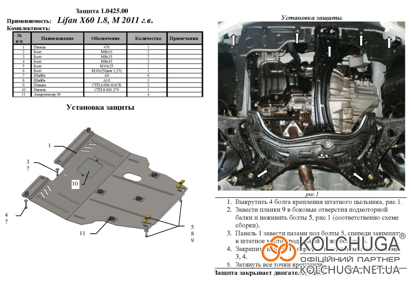 Ochrana motorového priestoru pre Lifan X60 rok od 2011 sa vyrába pomocou moderných technológií z materiálov najvyššej kvality. Ako základ používame za studena valcovanú oceľ s hrúbkou 2 mm. Pomocou lisovania dávame ochrane jedinečný tvar pre každý automobil tak, aby sa montovala na originálne montážne body bez potreby dodatočného vŕtania alebo zvárania. Vďaka tomu je proces inštalácie maximálne jednoduchý. Všetky potrebné montážne prvky sú súčasťou balenia.