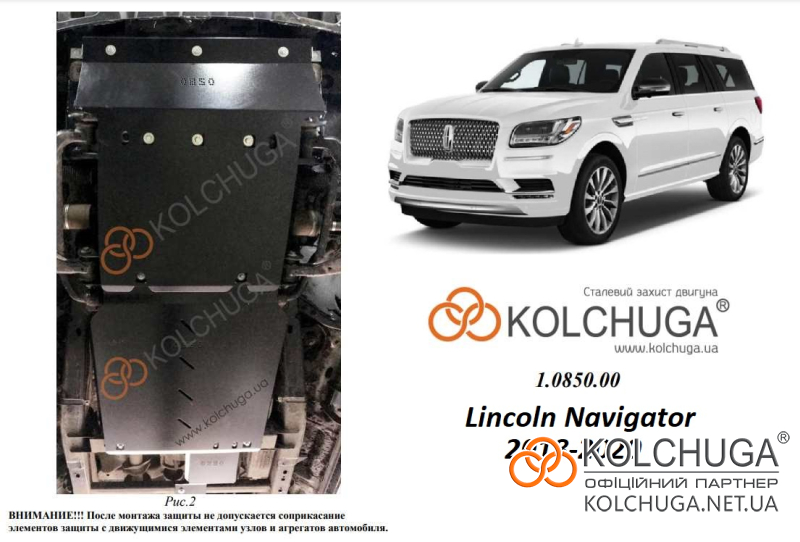 Ochrana motorového priestoru pre Lincoln Navigator 4 rok 2018-2020 sa vyrába pomocou moderných technológií z materiálov najvyššej kvality. Ako základ používame za studena valcovanú oceľ s hrúbkou 2 mm. Pomocou lisovania dávame ochrane jedinečný tvar pre každý automobil tak, aby sa montovala na originálne montážne body bez potreby dodatočného vŕtania alebo zvárania. Vďaka tomu je proces inštalácie maximálne jednoduchý. Všetky potrebné montážne prvky sú súčasťou balenia.