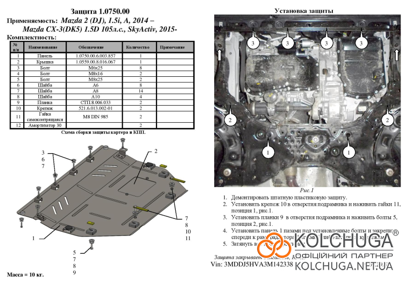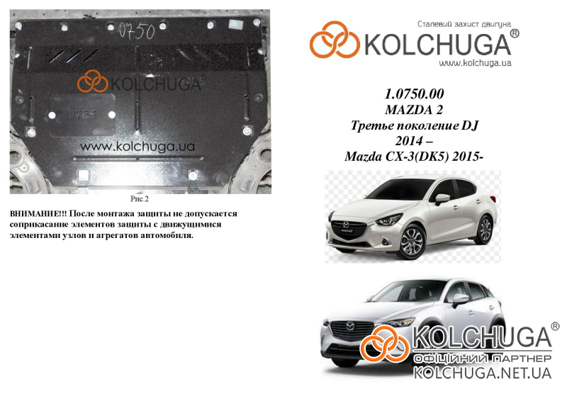 Ochrana motorového priestoru pre Mazda 2 DJ III rok od 2014 sa vyrába pomocou moderných technológií z materiálov najvyššej kvality. Ako základ používame za studena valcovanú oceľ s hrúbkou 2 mm. Pomocou lisovania dávame ochrane jedinečný tvar pre každý automobil tak, aby sa montovala na originálne montážne body bez potreby dodatočného vŕtania alebo zvárania. Vďaka tomu je proces inštalácie maximálne jednoduchý. Všetky potrebné montážne prvky sú súčasťou balenia.