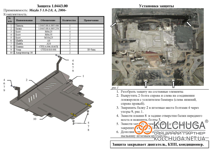 Ochrana motorového priestoru pre Mazda 5 CR II rok 2005-2010 sa vyrába pomocou moderných technológií z materiálov najvyššej kvality. Ako základ používame za studena valcovanú oceľ s hrúbkou 2 mm. Pomocou lisovania dávame ochrane jedinečný tvar pre každý automobil tak, aby sa montovala na originálne montážne body bez potreby dodatočného vŕtania alebo zvárania. Vďaka tomu je proces inštalácie maximálne jednoduchý. Všetky potrebné montážne prvky sú súčasťou balenia.